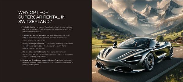 Supercar Rental Switzerland is Switzerland's premier luxury and sports car rental service, offering an unmatched selection of high-end vehicles for those seeking an extraordinary driving experience. Our fleet includes the latest models from prestigious brands like Lamborghini, Porsche, and Ferrari, catering to business trips, leisure travels, or special events. We prioritize customer satisfaction with transparent pricing and a seamless rental process. For those ready to explore Switzerland in style, Supercar Rental promises sophistication, luxury, and a memorable journey.